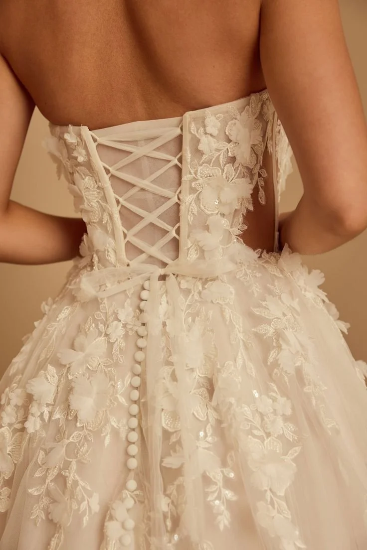 These dresses are dreamy, whimsical, and perfect for a rustic or garden wedding. We’ve seen brides walk down our aisle in these gowns, and the detail photographs beautifully.